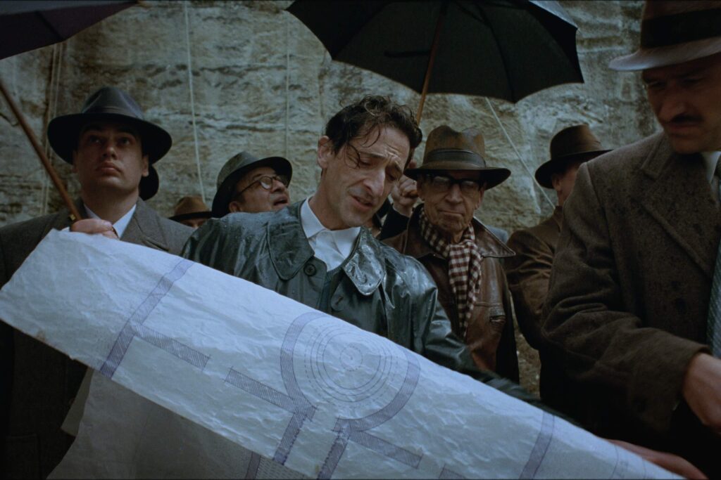 No resulta difícil percibir a El Brutalista como una película partida en dos, porque es precisamente así como Corbet ha decidido estructurarla, con un intermedio a la mitad. Por ende, y bajo esos términos, se puede decir que la primera parte de la película es mejor que la segunda, desarrollándose casi como una historia aspiracional de un inmigrante en los Estados Unidos que parece encontrar la grandeza. Corbet dirige esta primera parte con elegancia, usando el formato VistaVision (de mayor resolución y calidad que el celuloide común y corriente de 35mm) para resaltar la enormidad de las ambiciones de Lászlo. La primera mitad de El Brutalista se siente apropiadamente épica, remontándonos a clásicos como Érase una vez en América o la primera entrega de El Padrino.