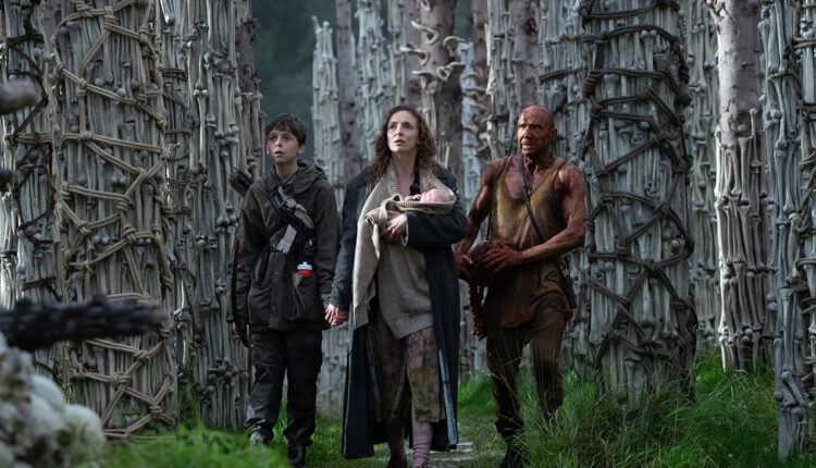 “Exterminio: la evolución” comienza con un prólogo a modo de flashback, en el que vemos a un pequeño Jimmy (Rocco Haynes) sobreviviendo a la infección zombie en las montañas escocesas. Veintiocho años después (ja), nos centramos en Jamie (Aaron Taylor-Johnson) y su hijo de doce años, Spike (Alfie Williams), quienes viven en una comunidad aislada en una isla junto a su enferma esposa y madre, Isla (Jodie Comer). Junto al resto del pueblo, se dedican a sobrevivir y, más importante, a usar sus arcos y flechas a cazar a los infectados que pueblan los bosques en el continente, a los que pueden acceder únicamente por un camino elevado que se revela cuando la marea baja.