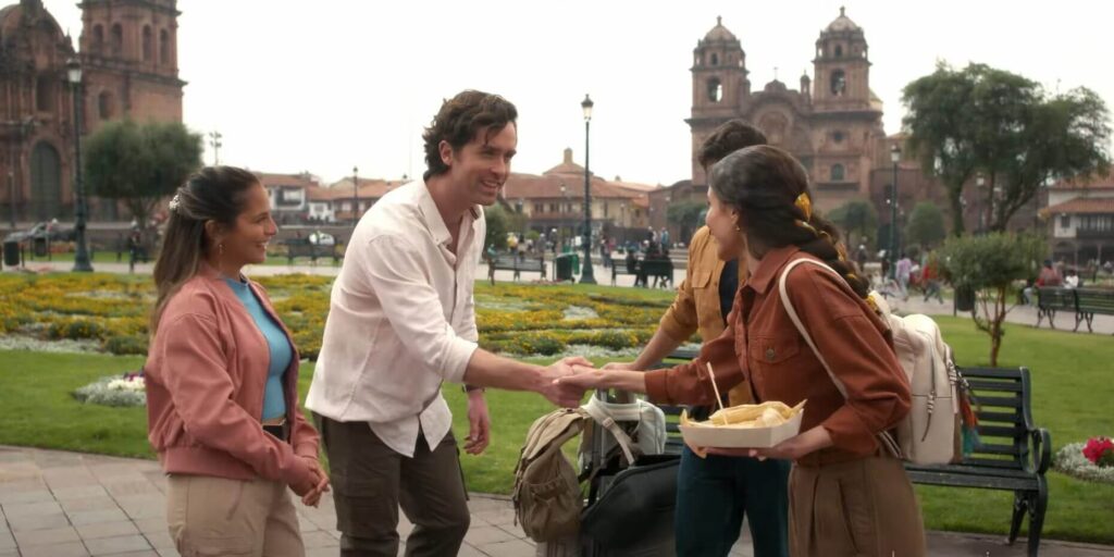 Lamento seguir con la comparación, pero a diferencia del filme de Paddington, que invisibilizaba al peruano y lo reemplazaba con secundarios británicos (o en el caso de Antonio Banderas y su hija, españoles), A Machu Picchu Proposal se lleva a cabo en un Cusco más o menos realista poblado por cuzqueños, que sí, están todos la servicio de los protagonistas… a excepción de la Luciana de Michelle Rosselló (enérgica, carismática, de buen inglés) y su familia. El haber puesto a una actriz local en un papel importante para la historia es un golazo, y ayuda a que A Machu Picchu Proposal se sienta más auténtica en sus intenciones, y de paso ayuda a justificar la llegada de Katie y Dan al Cusco.