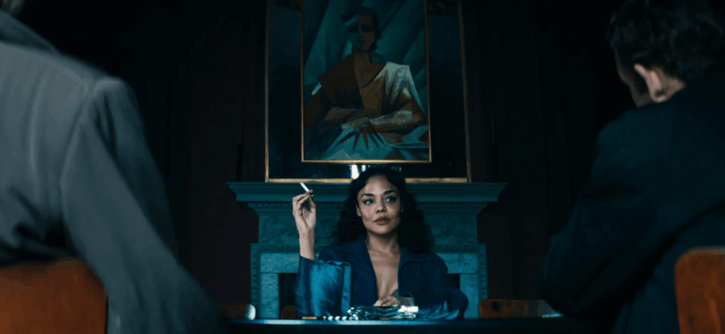 Las cosas se complican, sin embargo, primero con la llegada de Thea Clifton (Imogen Poots, una de las actrices británicas más infravaloradas de su generación), la nueva compañera de trabajo (quizás pareja) de una académica con la que Hedda comparte un pasado tortuoso, Eileen Lovborg (Nina Hoss). Nuestra protagonista hace de todo por acomodar a Thea en la fiesta, pero cuando finalmente llega, también, Eileen al lugar, las cosas se salen de control. Después de todo, resulta que esta última quiere el mismo puesto que George, y ha llegado con el manuscrito del libro que ha escrito junto a Thea para convencer a Greenwood de que la contraten. Por ende, Hedda se empecina en hacer de todo por sabotear a estas dos mujeres, no solo para que su esposo pueda conseguir trabajo, sino también para que no pierdan su mansión.