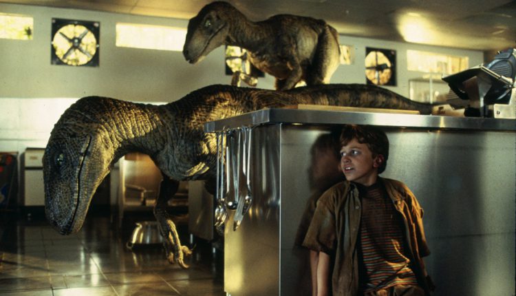 Pero lo más sobresaliente, la razón principal por la que la gente ve Jurassic Park, es por los dinosaurios, e incluso 20 (!) años después de su estreno, estas criaturas no dejan de sorprender. A diferencia de la mayoría de películas contemporáneas, el filme no hace uso exclusivo de imágenes digitales para crear a los dinosaurios – se trata, pues de una mezcla entre CGI (para las tomas más lejanas), dinosaurios animatrónicos reales (para los primeros planos), e incluso una que otra toma realizada con la técnica de stopmotion. Esta mezcla de métodos hace que los dinosaurios se vean absolutamente reales; no hay ninguna toma que se vea demasiado caricaturezca o falsa, cosa que sucede en muchos filmes contemporáneos que abusan de los efectos digitales. Y lo más interesante es que los dinosaurios no hacen su aparición hasta bien avanzada la película. De manera similar a lo que hizo con Tiburón, Spielberg crea anticipación y tensión, para poder así revelar a las criaturas de la manera más majestuosa e increíble posible (de hecho la música del gran John Williams ayuda.) Revelarlos durante el principio del filme no hubiera tenido el mismo efecto.