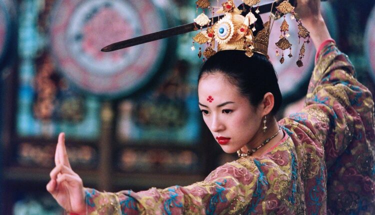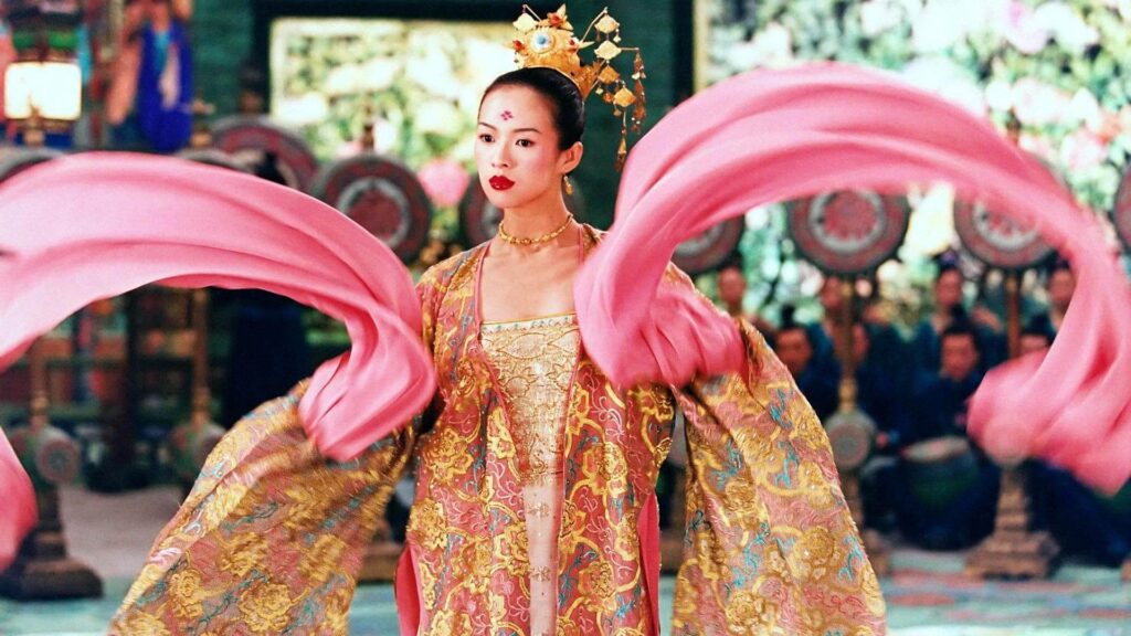 Por otro lado, al inicio de la película tenemos el Juego del Eco. Luego de encontrar a Mei, Leo la coloca en medio de una habitación rodeada de tambores, y comienza a lanzar maníes a los tambores. La idea es que Mei tiene que darle a los mismos tambores con las mangas alargadas de su vestido. Obviamente con cada ronda va aumentando la dificultad de los movimientos, lo cual no hace más que motivar a la Mei de Ziyi a cumplir con coreografías más complejas, las cuales son presentadas a través de planos generales vistosos, y planos cercanos que hacen un gran énfasis en su rostro, en el movimiento de sus brazos, y en la fluida manera en que se mueve la tela de sus mangas. Es todo espectacular, completamente fantasioso, y final del día, altamente hipnotizante.