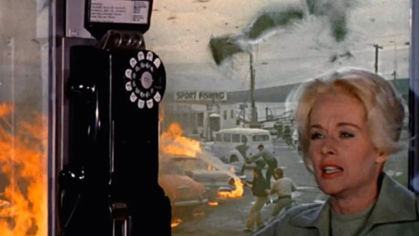 Puede que la primera mitad de “Los pájaros” se concentre más en las interacciones entre personajes y el drama que se va desarrollando entre Melanie y los habitantes del pueblo al que ha llegado, pero es durante la segunda que las cosas se tornan más intensas. Como en buena parte de su filmografía, Hitchcock demuestra ser un maestro a la hora de generar suspenso, aprovechando al máximo la presencia de los pájaros — de lejos, parados encima de techos o juegos de jardín, o de cerca, picoteando e hiriendo a nuestros protagonistas. Resaltan secuencias como la de la gasolinera (que incluye explosiones y todo; ¡como en una película moderna!), el momento en el que Melanie se queda atrapada en una cabina telefónica (una imagen clásica), y un tenso recorrido casi a oscuras por la casa de Mitch, con Melanie buscando la fuente de un ruido extraño. Es en estos momentos que “Los pájaros” me tuvo al borde del asiento, mordiéndome las uñas.